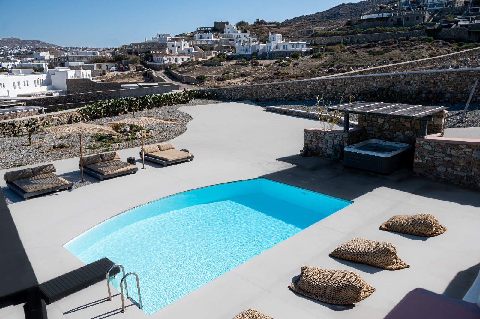 Οι εξωτερικοί χώροι προσκαλούν τους επισκέπτες να βιώσουν στο έπακρο τον μυκονιάτικο τρόπο ζωής, διαθέτοντας ιδιωτική πισίνα, εξωτερικό jacuzzi, καθώς και κομψούς χώρους χαλάρωσης και τραπεζαρίας με φόντο ένα εντυπωσιακό παραθαλάσσιο τοπίο.