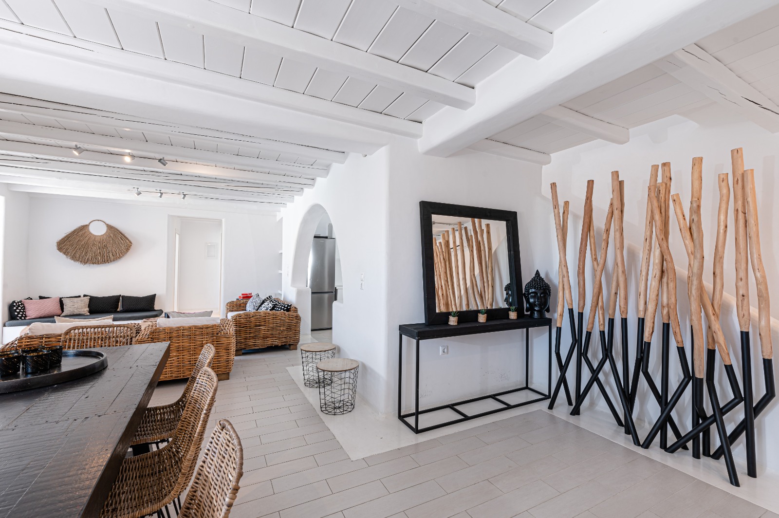Με συνολικό εμβαδόν 260 τ.μ., η βίλα μπορεί να φιλοξενήσει έως 14 επισκέπτες σε έξι προσεγμένα διαμορφωμένα υπνοδωμάτια, καθιστώντας την ιδανική επιλογή για μεγάλες οικογένειες ή παρέες φίλων. Οι εσωτερικοί χώροι ακολουθούν μια σύγχρονη μίνιμαλ αισθητική με διακριτικές κυκλαδίτικες επιρροές. Το μεγάλο ενιαίο καθιστικό και τραπεζαρία προσφέρεται ιδανικά τόσο για στιγμές χαλάρωσης όσο και για κοινωνικές συναθροίσεις.