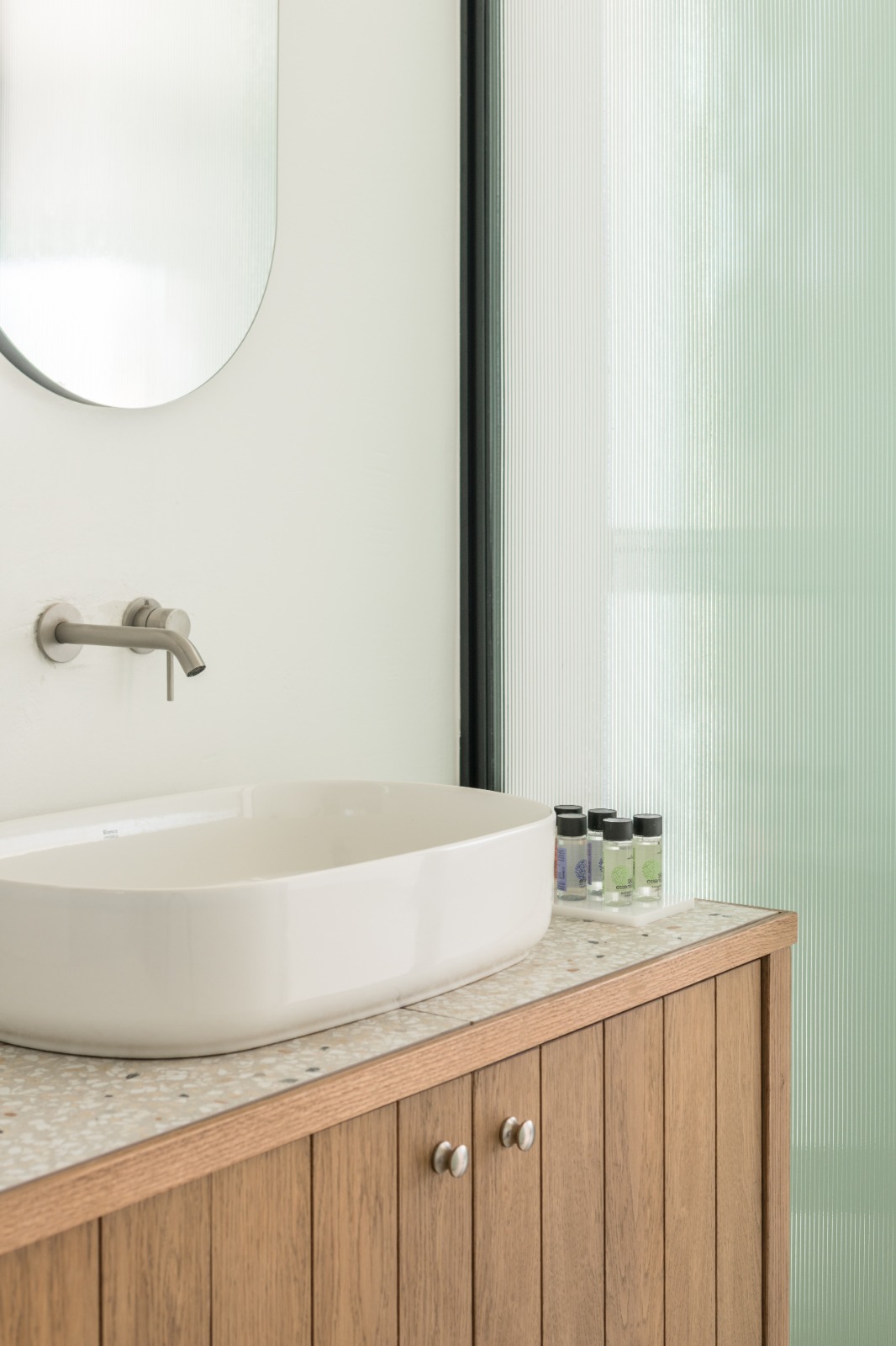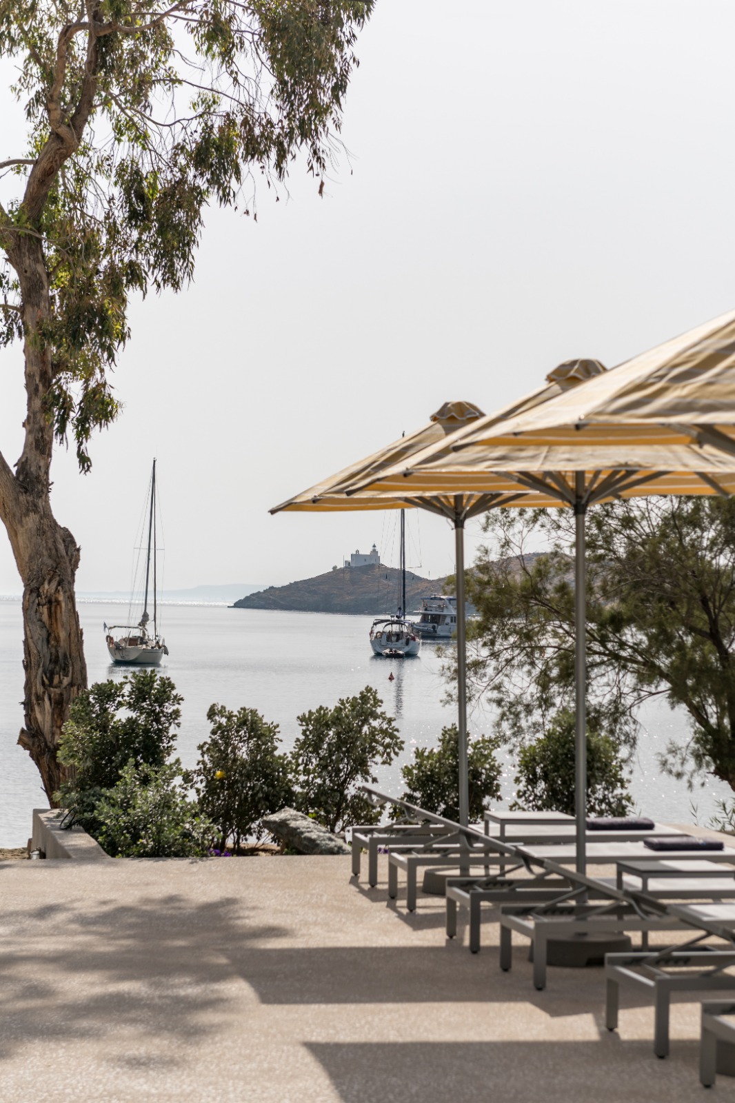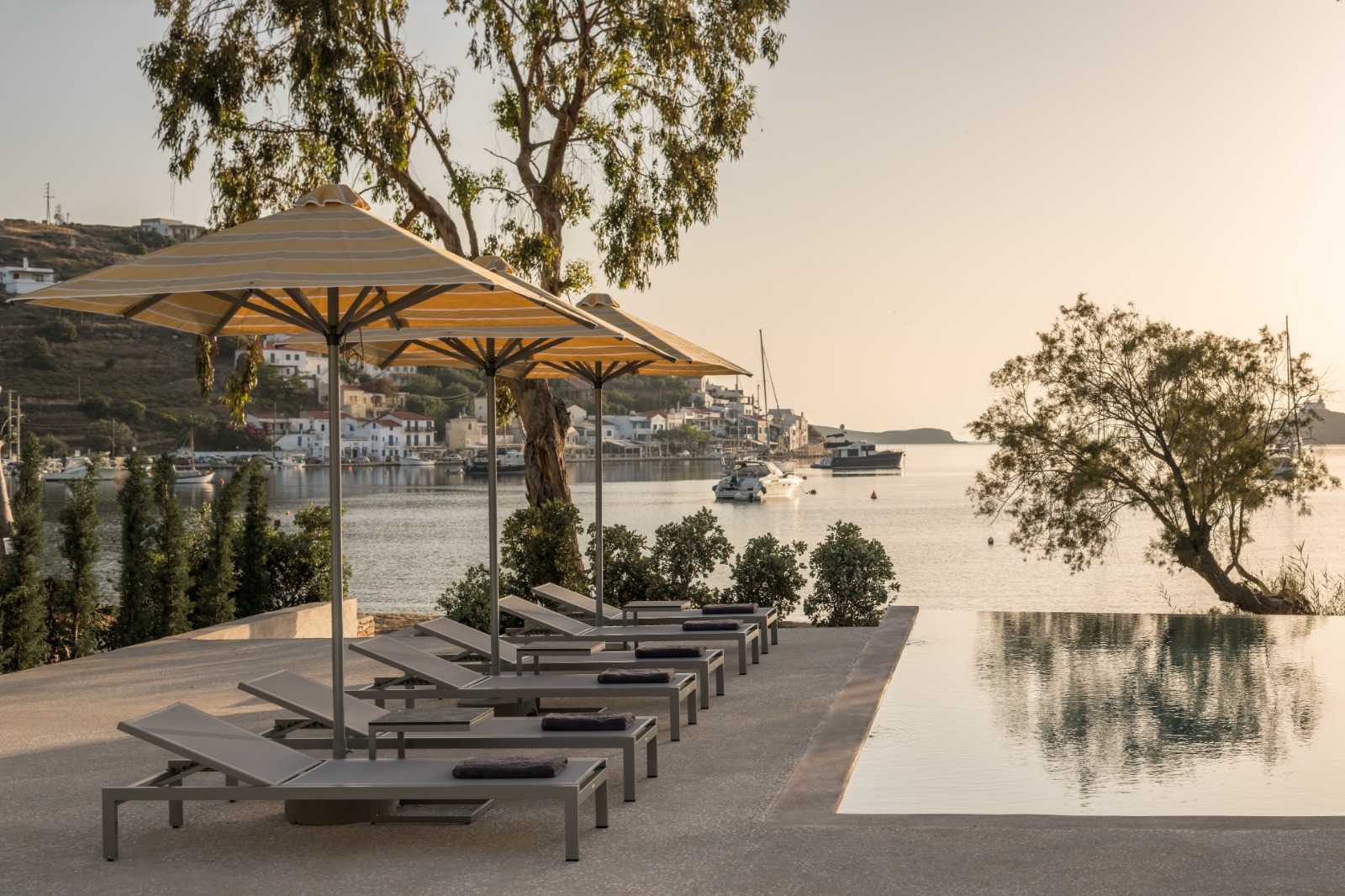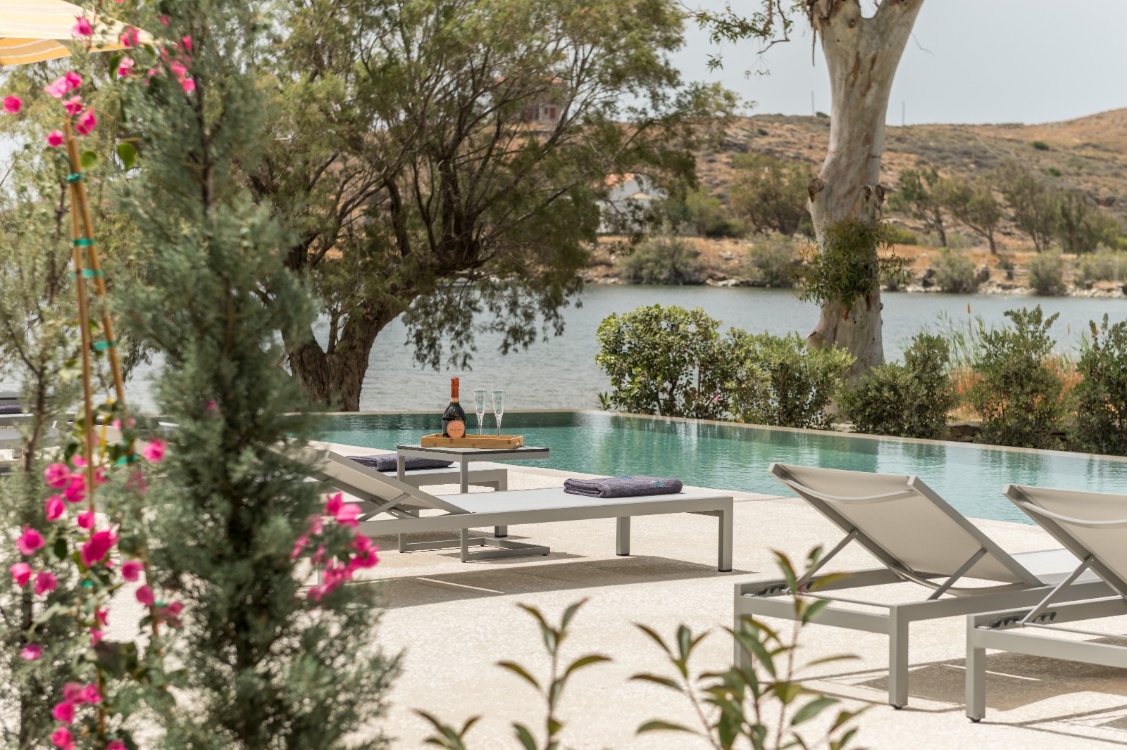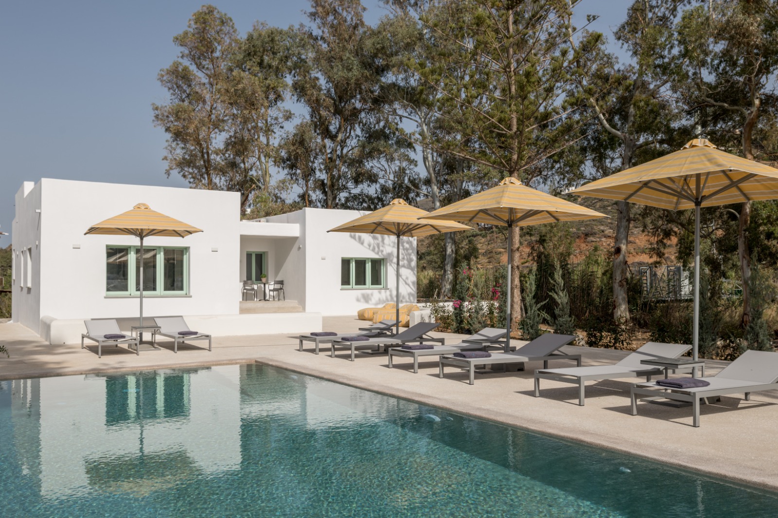 Οι επισκέπτες απολαμβάνουν επίσης αποκλειστική πρόσβαση στον ατμοσφαιρικό κοινόχρηστο χώρο με πισίνα υπερχείλισης, ο οποίος συμπληρώνεται από ιδιωτικές ξαπλώστρες, πουφ, ομπρέλες και τραπεζάκια, ιδανικά για στιγμές απόλυτης χαλάρωσης.