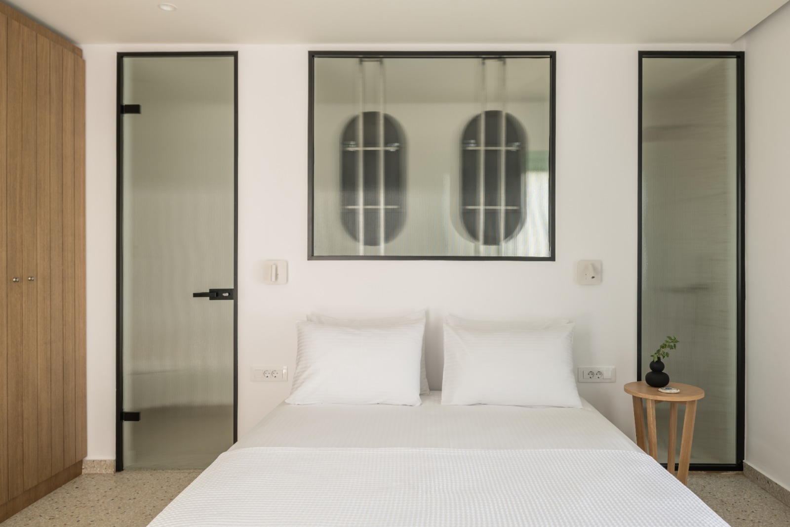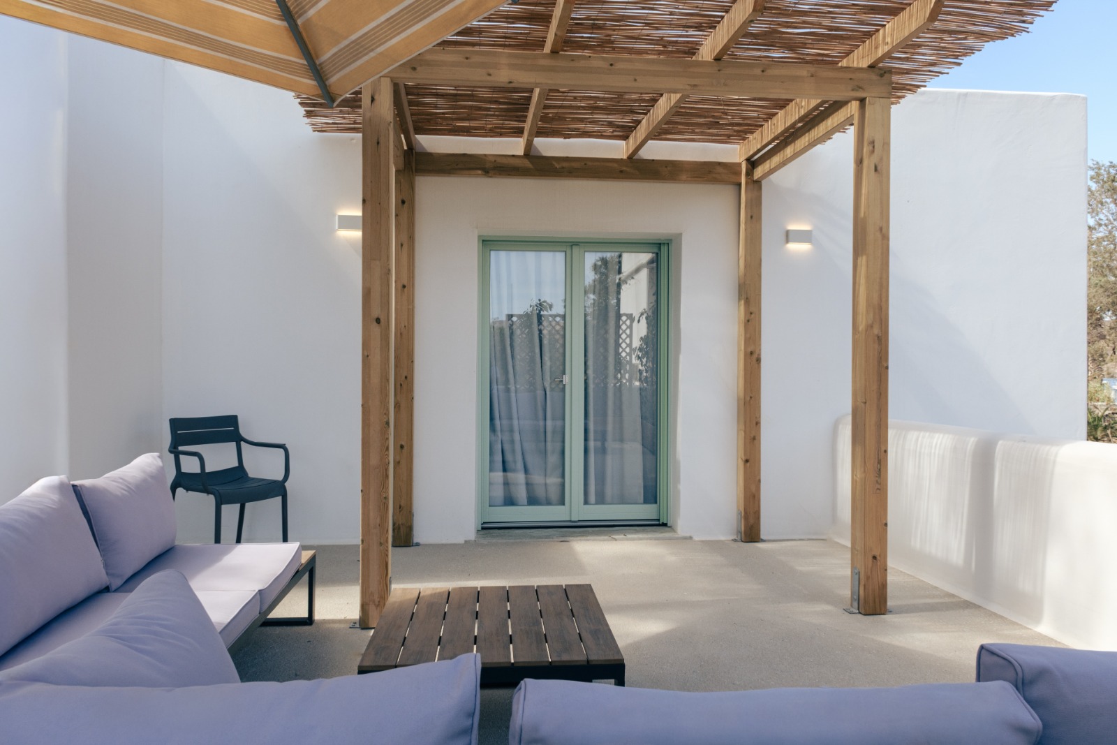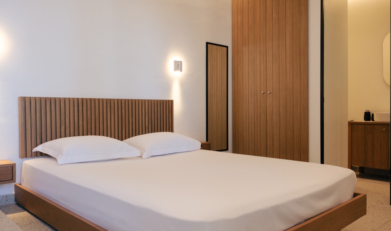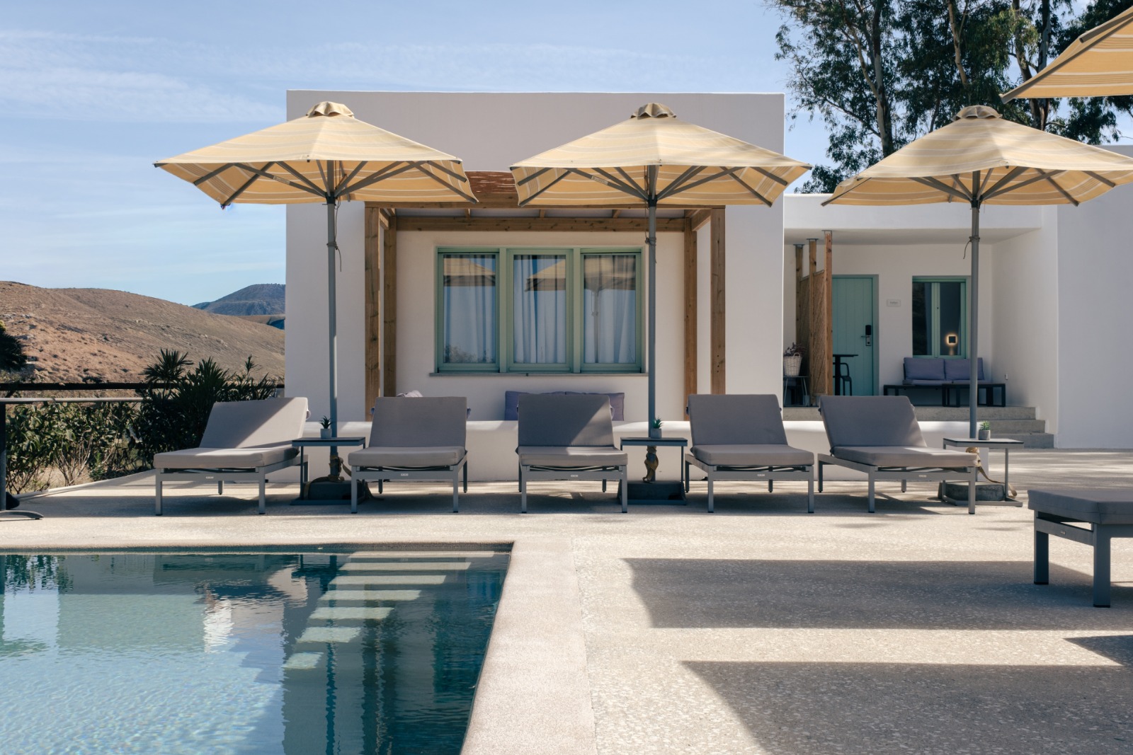Η ευρύχωρη ντουλάπα εξασφαλίζει άνετους και λειτουργικούς αποθηκευτικούς χώρους, ενώ οι παροχές υψηλών προδιαγραφών — όπως minibar, smart TV, κλιματισμός και μηχανή espresso — εγγυώνται ένα ανώτερο επίπεδο άνεσης. Οι επισκέπτες απολαμβάνουν επίσης αποκλειστική πρόσβαση στον ατμοσφαιρικό κοινόχρηστο χώρο με πισίνα υπερχείλισης, ο οποίος συμπληρώνεται από ιδιωτικές ξαπλώστρες, πουφ, ομπρέλες και τραπεζάκια, ιδανικά για στιγμές απόλυτης ξεκούρασης και χαλάρωσης.