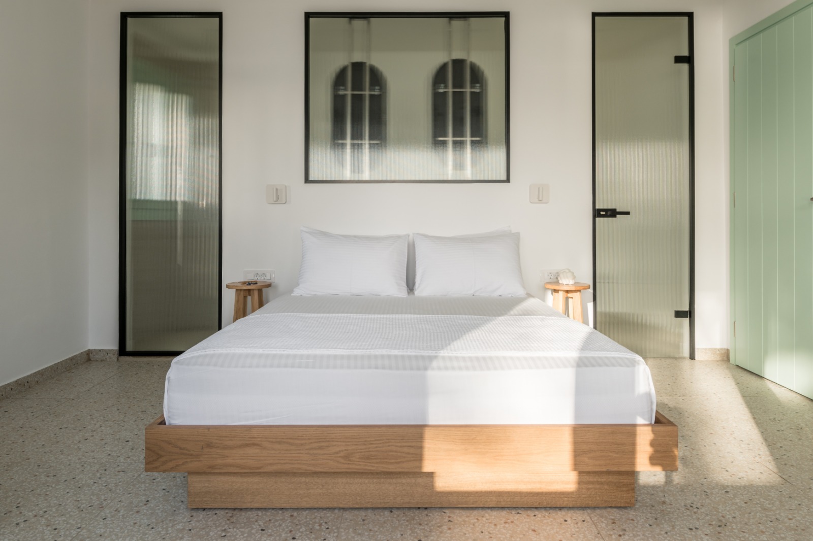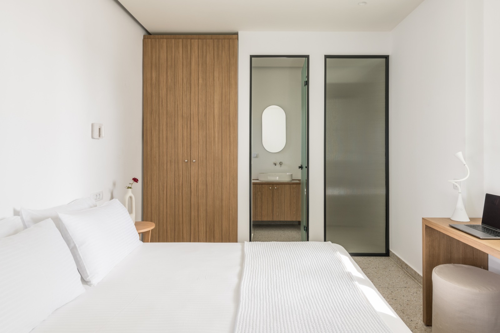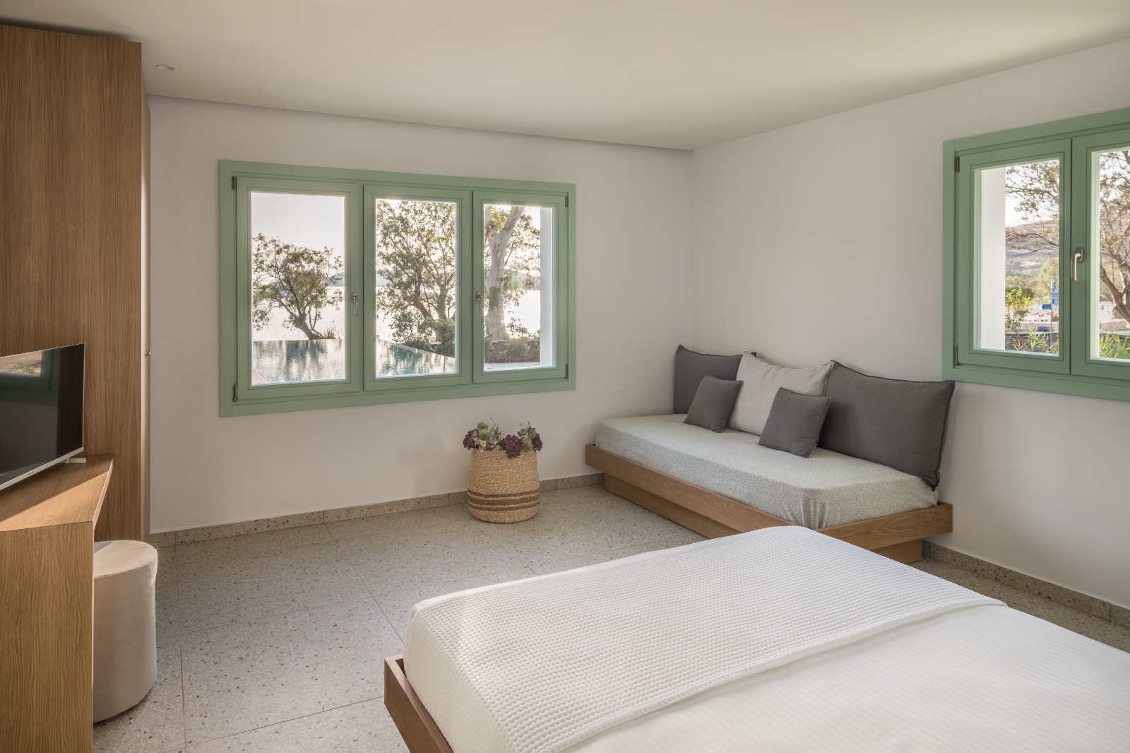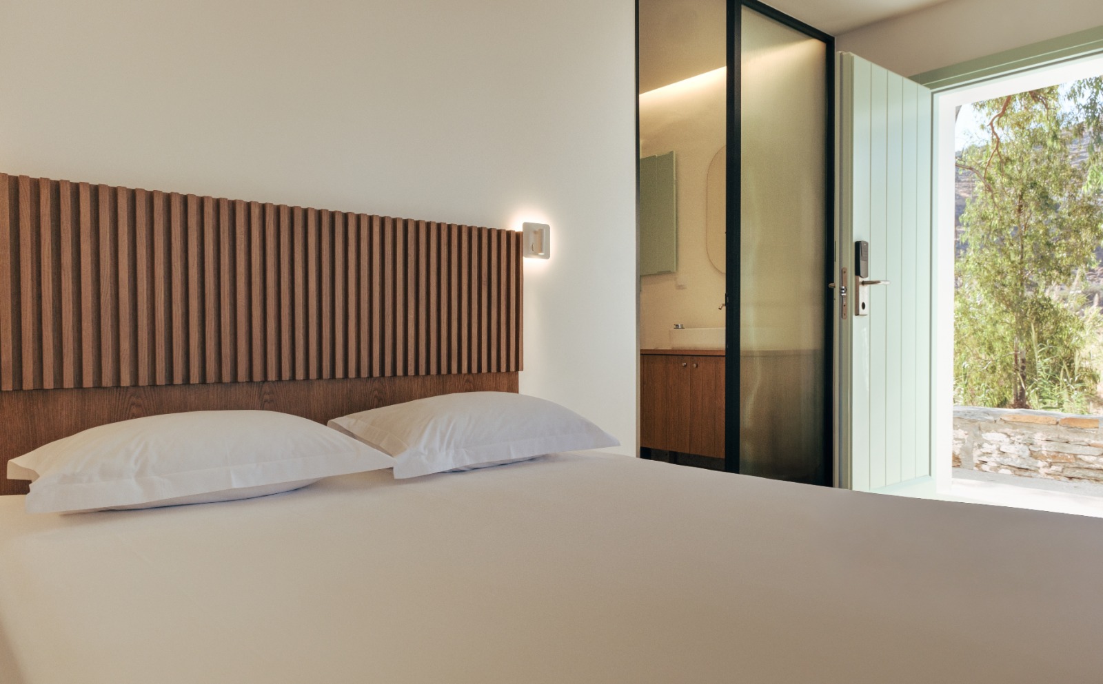 Η ευρύχωρη ντουλάπα εξασφαλίζει άνετους και λειτουργικούς αποθηκευτικούς χώρους, ενώ οι παροχές υψηλών προδιαγραφών — όπως minibar, smart TV, κλιματισμός και μηχανή espresso — εγγυώνται ένα ανώτερο επίπεδο άνεσης. Οι επισκέπτες απολαμβάνουν επίσης αποκλειστική πρόσβαση στον ατμοσφαιρικό κοινόχρηστο χώρο με πισίνα υπερχείλισης, ο οποίος συμπληρώνεται από ιδιωτικές ξαπλώστρες, πουφ, ομπρέλες και τραπεζάκια, ιδανικά για στιγμές απόλυτης ξεκούρασης και χαλάρωσης.