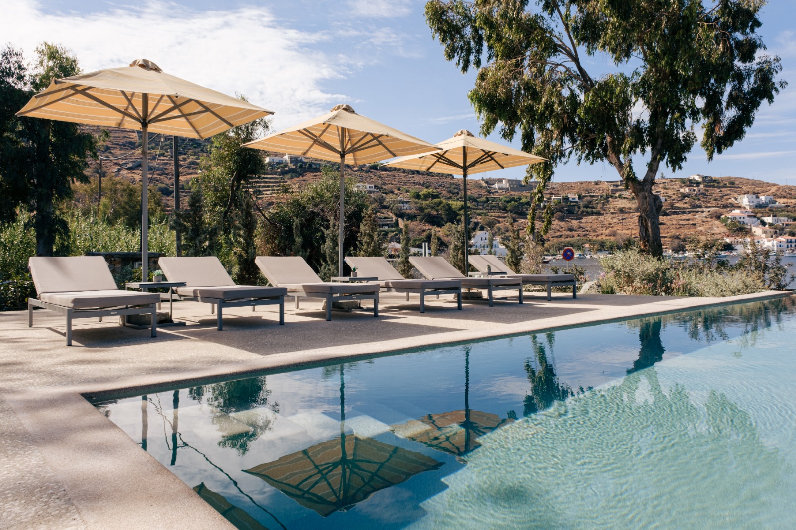 Οι επισκέπτες απολαμβάνουν προνομιακή πρόσβαση στον ατμοσφαιρικό κοινόχρηστο χώρο με πισίνα infinity, ο οποίος συμπληρώνεται από ιδιωτικές ξαπλώστρες, πουφ, ομπρέλες και τραπεζάκια, ιδανικά σχεδιασμένα για στιγμές απόλυτης χαλάρωσης.