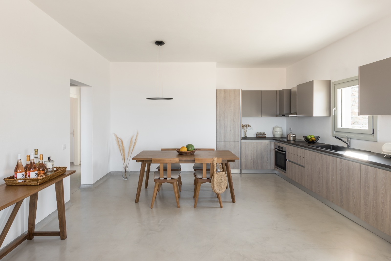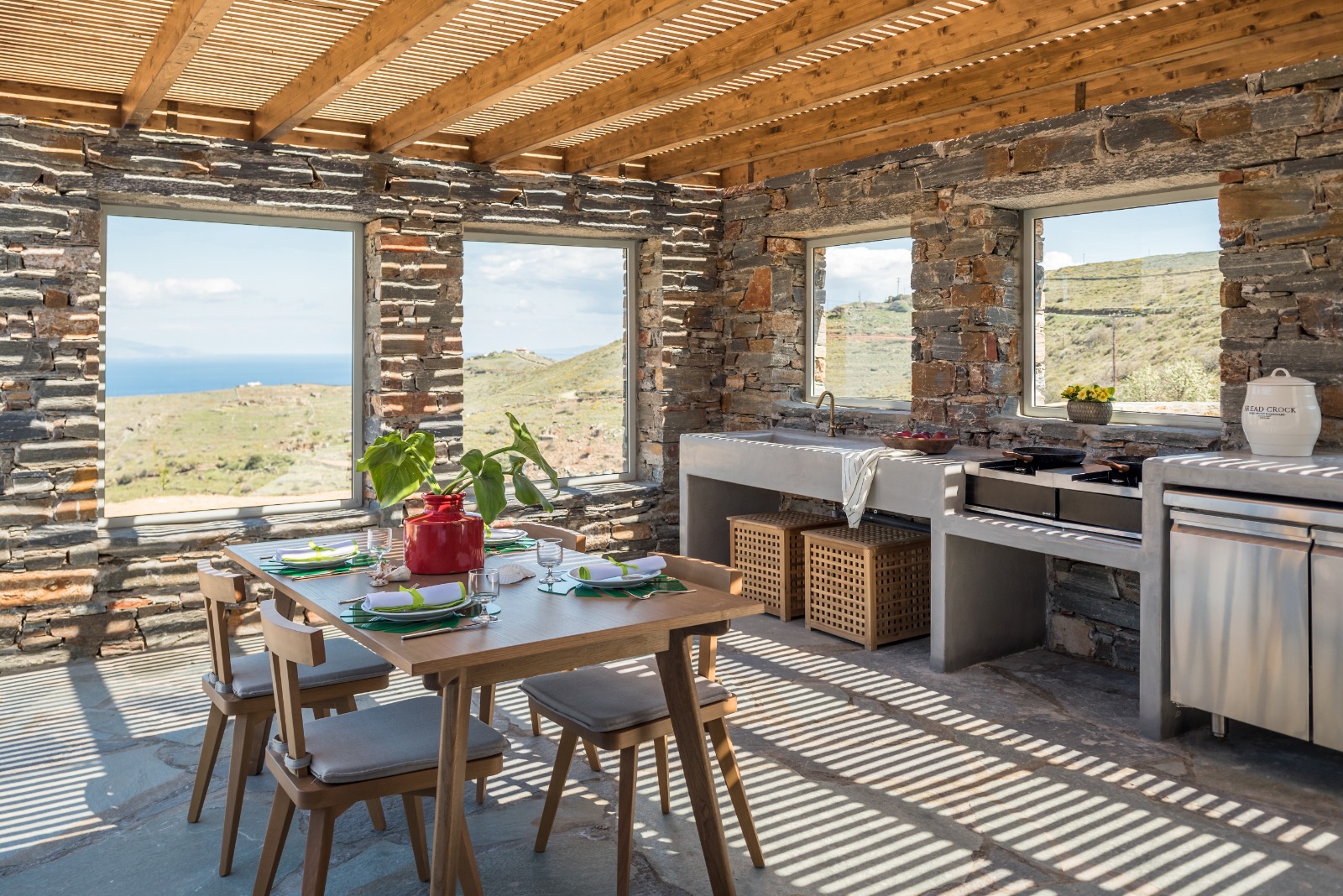 Στον εξωτερικό χώρο, μια πλακόστρωτη αυλή με χτιστή τραπεζαρία κάτω από μια ξύλινη πέργκολα προσφέρει μαγευτική θέα στο Αιγαίο, δημιουργώντας το ιδανικό σκηνικό για ήρεμες καλοκαιρινές βραδιές και αξέχαστες στιγμές χαλάρωσης.