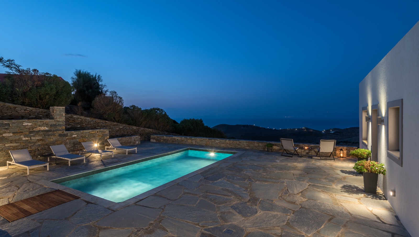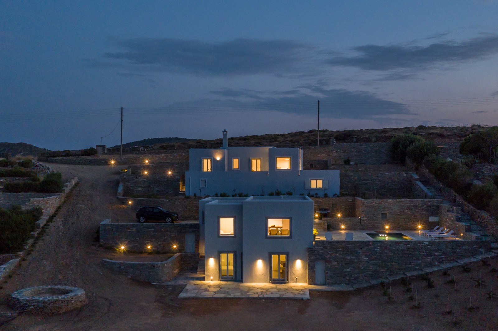 Οι ευρύχωροι εσωτερικοί χώροι έχουν σχεδιαστεί προσεκτικά ώστε να δημιουργούν μια ζεστή και φιλόξενη ατμόσφαιρα, συνδυάζοντας τη σύγχρονη άνεση με οικολογικά στοιχεία. Στον εξωτερικό χώρο, η απλή κομψότητα εναρμονίζεται απόλυτα με το ήρεμο περιβάλλον. Οι επισκέπτες μπορούν να απολαύσουν αξέχαστες στιγμές στην ευρύχωρη τραπεζαρία κάτω από την ξύλινη πέργκολα, να χαλαρώσουν στο lounge της πισίνας και να θαυμάσουν το εκπληκτικό τοπίο υπό τον φωτεινό, έναστρο ουρανό.